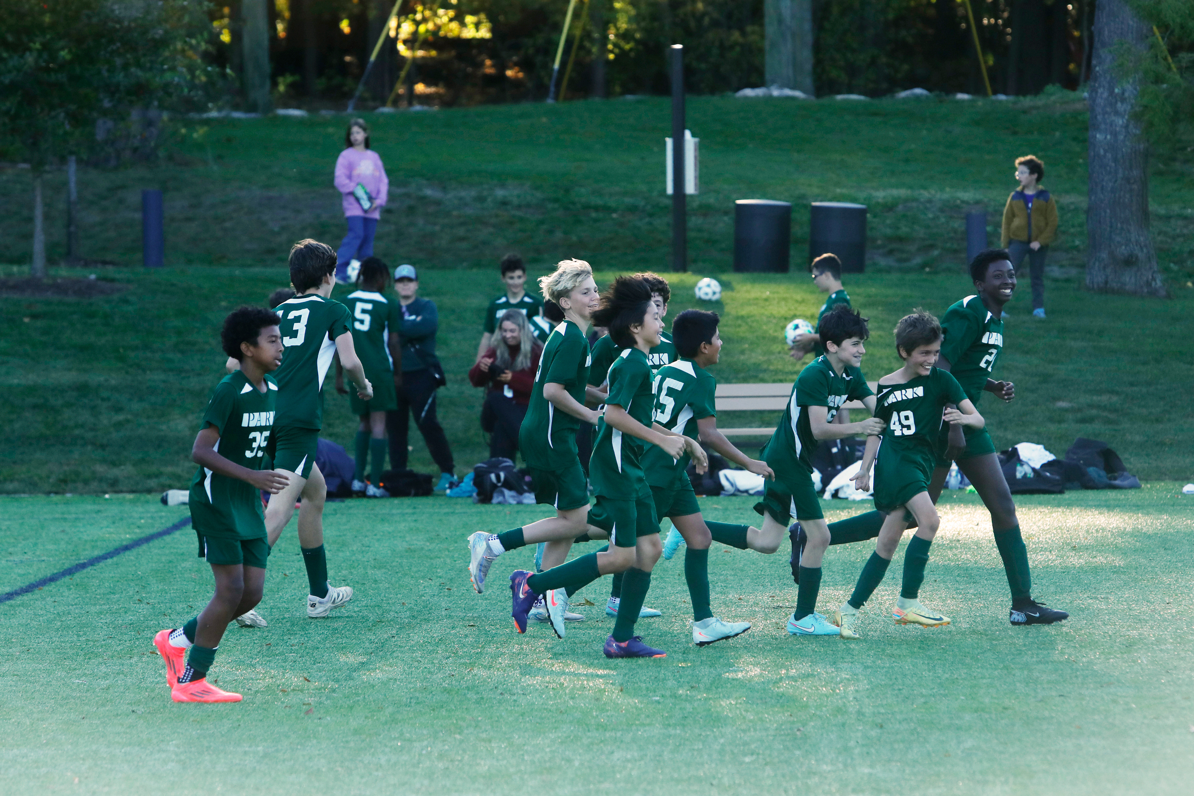 All teams demonstrated significant improvement between September and November. Coach Karl Dreyer was particularly impressed with the Cross Country team’s increase in stamina: “At the beginning of the season, there were many walkers even on a 10-minute run, but by the end of the season, everyone was able to run nonstop for at least 25 minutes. They also got much faster at the post-run sprints!” MS 5/6 Flag Football started off 0-2 but proceeded to win seven of their last nine games. Coach Jason White notes, “Our defense, which is dependent on every member of the team working together, never gave up more than six points in our last four games.” Coach Mina Roustaei says that a highlight of the Varsity Volleyball season was seeing athletes new to the sport learn techniques at practice and then “watching them deliver these new moves and celebrate their victories on the court at each game!” JV Volleyball had many athletes who were new to the game, but buoyed by great team spirit, the group worked hard and produced some exciting wins, including a thrilling victory on Park vs. Shady Hill Game Day. Boys’ Varsity Soccer also showed marked improvement during the season, perhaps best demonstrated by the fact that they lost to Derby 8-0 early on and later almost tied the same team in a tight game with a completely different tenor.