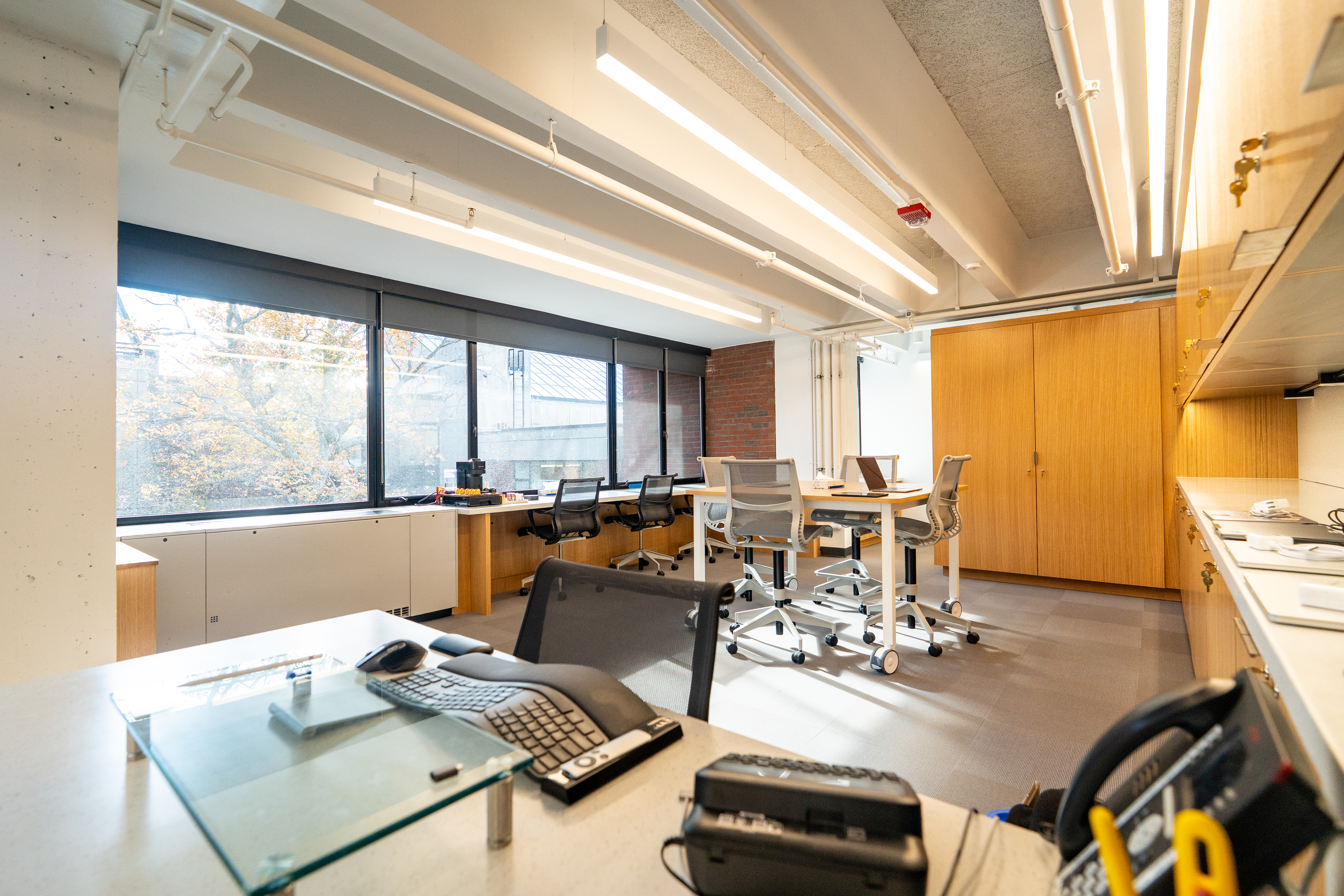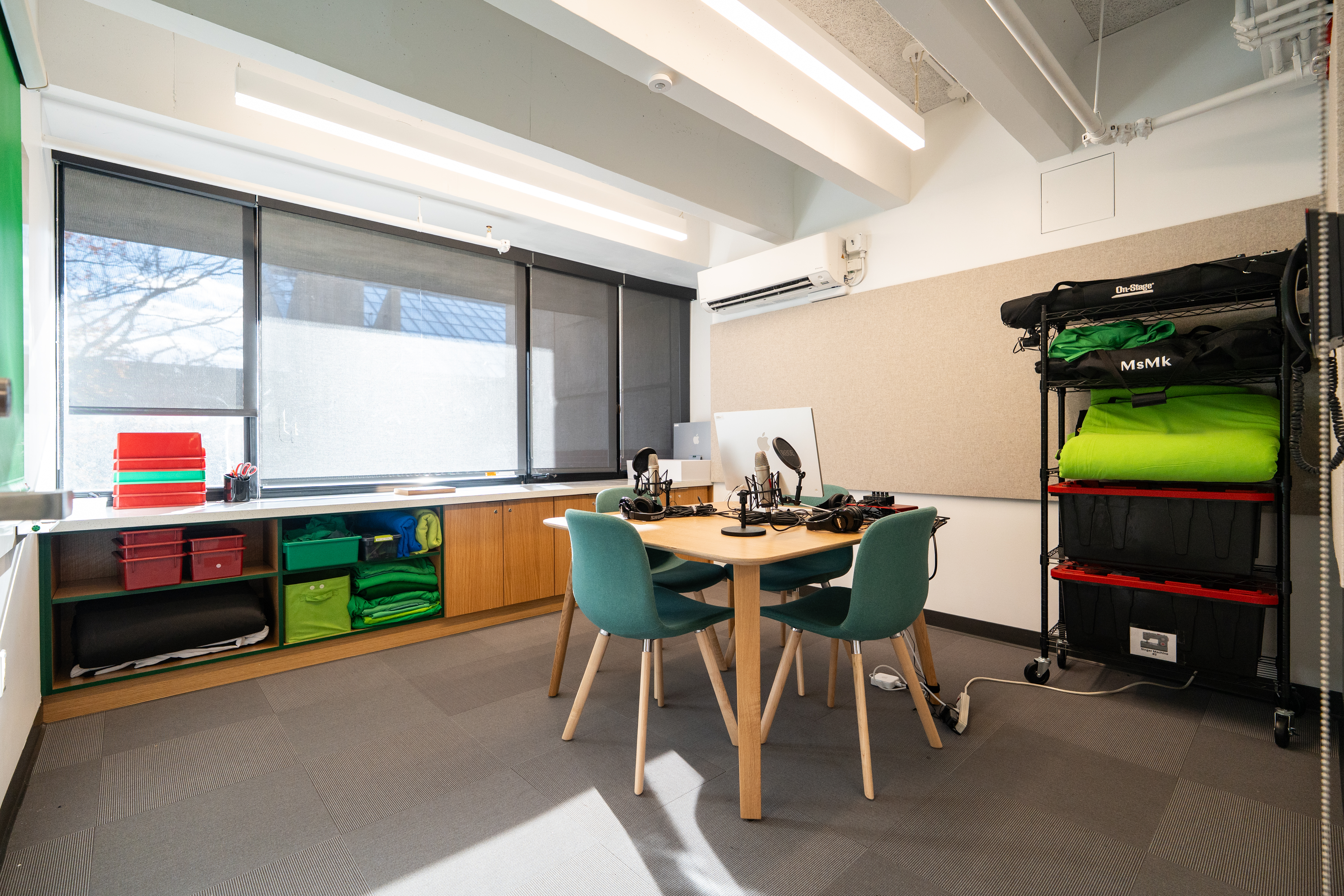 The opportunity to relocate the technology office made way for a new recording and podcasting studio adjacent to the library on the fourth floor, supporting student multimedia creation in podcasting, video, and more. Next door, Park’s tech team enjoys a bright, sunny new workspace.