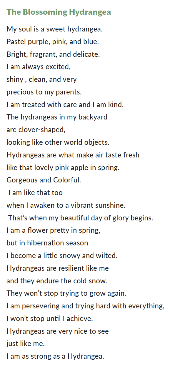 In Grades 5 and 6, students experience what Lauren describes as a “poetry sampling.” They study and write poetry and learn to appreciate how poetry includes features such as figurative language and sensory details. They read several novels in verse, which have been a newer way to incorporate more poetry into the curriculum. In Grade 6, students participate in the “Poetry Olympics,” in which they practice writing poems in various formats or in the style of famous poets. Over the years, the Poetry Olympics have included writing odes to commonplace objects, “soul poems” to practice using extended metaphors, and "I Am the Greatest" poems inspired by Muhammad Ali.