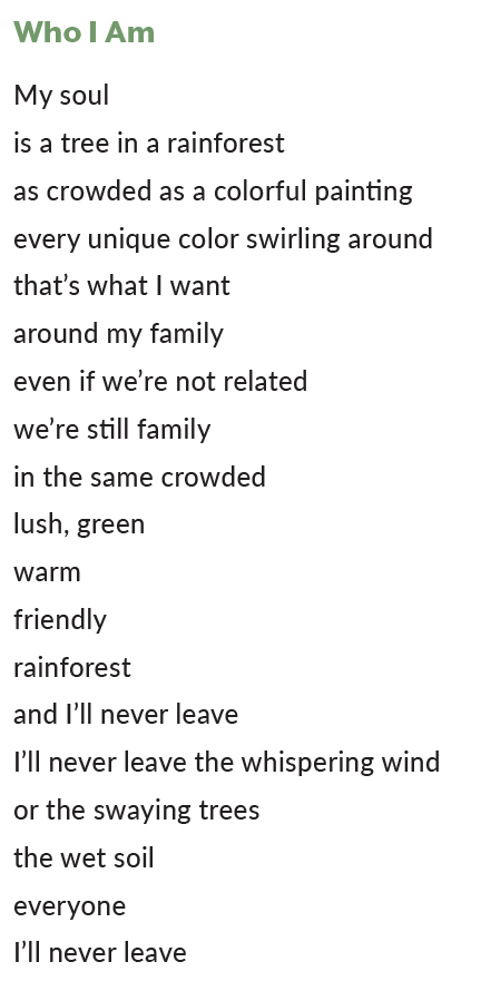 In Grade 7, students shift to using poetry as a way to react to other styles of writing. For instance, they might rewrite a scene in poetry or write a poem from a particular character’s perspective. In conjunction with reading Jason Reynolds’ novel Look Both Ways, students write personal poems about places of meaning to them. As in Grades 5 and 6, Lauren explains, poetry provides a “huge benefit” to students’ analytical thinking and strengthens their writing in other genres.